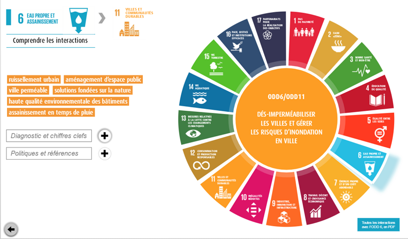 A titre d’illustration, si on prend l’ODD 6 qui porte sur l’eau propre et l’assainissement, la rosace explicite les interactions possibles avec les 16 autres ODD. En cliquant par exemple sur le pétale correspondant à l’ODD 11 qui porte sur les villes et communautés durables, une liste de thématiques communes apparaît : ruissellement urbain, aménagement d’espace public, ville perméable, solutions fondées sur la nature, haute qualité environnementale des bâtiments, assainissement en temps de pluie.
