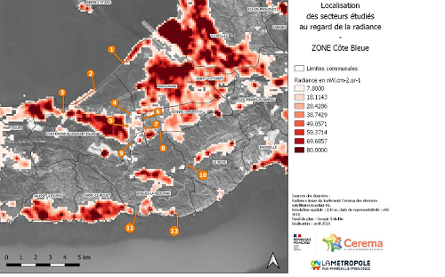 Les travaux menés sur le périmètre de la métropole Aix-Marseille-Provence basés sur cette image satellite ont été synthétisés : l'image satellite a permis d'identifier les secteurs naturels du territoire selon leur niveau d'affectation par la pollution lumineuse, puis d'aller les caractériser sur le terrain, de jour et de nuit, au moyen de photographies et de mesures des grandeurs d'éclairage, afin d'émettre des recommandations pour maintenir voire restaurer un bon fonctionnement nocturne de ces territoires, et des ecosystèmes qu'ils accueillent