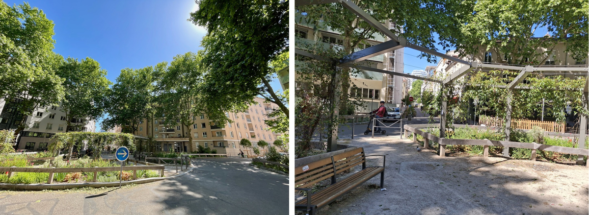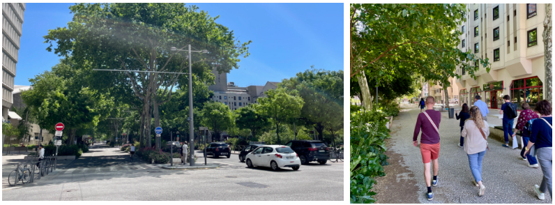 - Des aires piétonnes, avec une fermeture à la circulation motorisée des dispositifs physiques, intégrant une végétalisation importante (arbres et strates basses),