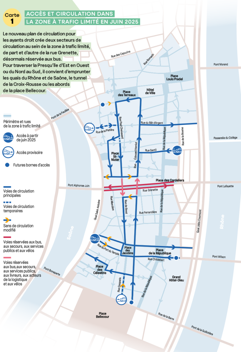Après les ré-aménagement des premiers secteurs (Place des Terreaux, rue Emile Zola), la démarche se poursuit avec un objectif d’apaisement renforcé de la Presqu’île. Depuis le 21 juin 2025, un nouveau plan de circulation avec une zone à trafic limité (voies à accès réservé) ainsi qu’une nouvelle organisation des bus ont été mis en place. Celle-ci s'étend des pentes de la Croix-Rousse jusqu’au nord de la place Bellecour. L’objectif est de supprimer le trafic de transit afin d’offrir plus d'espaces aux piétons et aux cyclistes, tout en maintenant des accès essentiels pour les habitants, commerçants et professionnels.