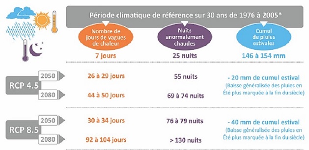 Ils sont caractérisés par l’évolution, au cours des années et jusqu’à 200, du bilan radiatif de la terre ou forçage radiatif (en W/m²) représentatif des concentrations de GES dans l’atmosphère (Radiative Concentration Pathway). Les scénarios climatiques retenus sont de RCP 8,5 pour celui vers lequel on se dirige et RCP 4,5 si l’on met en œuvre des actions dès maintenant. L’écart à l’horizon 2050 est assez faible, mais à partir de 2080 , ces scénarios divergent.