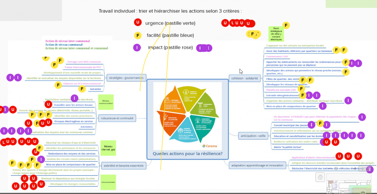 Ces ateliers ont permis, outre une acculturation et une appropriation par les élus des deux commissions Gestion des Risques et Transition Ecologique et Energétique et lutte contre les Pollutions de la notion de résilience territoriale, d’appréhender une vision systémique des enjeux de leur territoire, de définir de premières actions pour en renforcer la résilience et d’initier une pratique de travail collectif et coopératif pour améliorer la vie présente et à venir de ses habitants.
