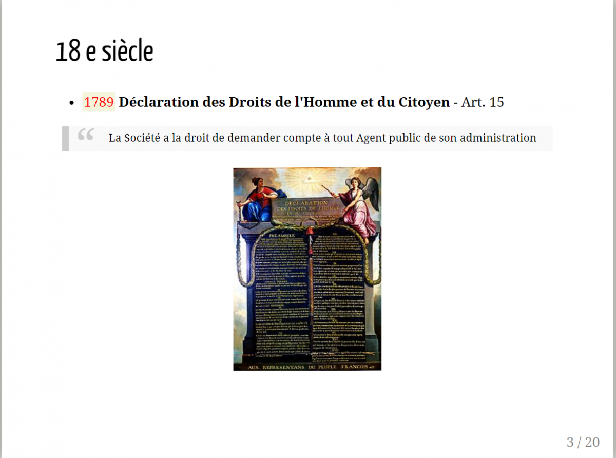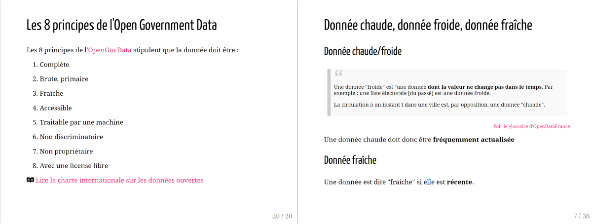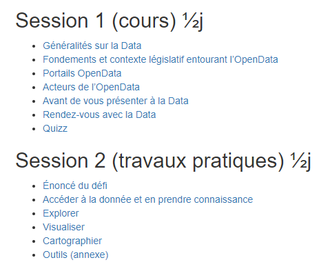 Dans la première session, on trouve ainsi une brève histoire des données numériques, les fondements historiques et législatifs entourant l’ouverture des données, les enjeux démocratiques mais aussi les inquiétudes liés aux données, un "bestiaire de la donnée" avec des éléments terminologiques, des exemples de portails de données ainsi que des exemples de réutilisations.