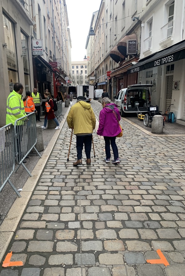 Parmi les revêtements les moins appréciés, l’inconfort voire l’impraticabilité des pavés lyonnais bruts a fait (sans surprise) l’unanimité chez tous les testeurs. Les joints rapprochés du fait de la petite taille des modules occasionnent de multiples gênes : ils entraînent le blocage de la canne blanche des personnes déficientes visuelles ou « freinent » les usagers en fauteuil. Mais surtout ils génèrent des secousses pouvant être douloureuses pour les personnes en fauteuil ainsi que pour celles se déplaçant avec une canne blanche (les vibrations remontant dans le poignet et le bras). Ce revêtement demande un effort de concentration important aux usagers.