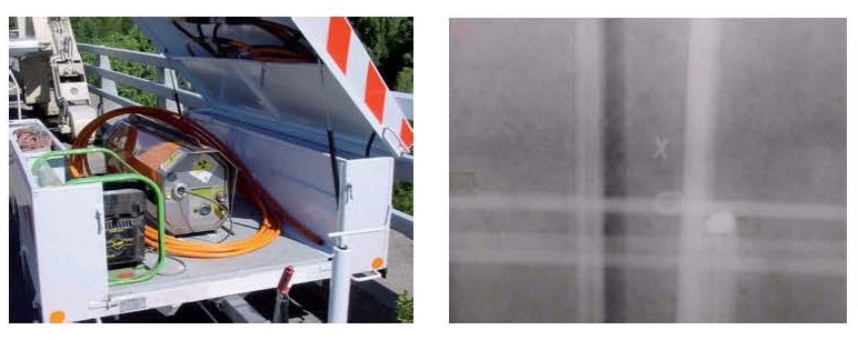 Le Cerema Centre-Est a mené des auscultations par gammagraphie, nécessitant des dispositions particulières d’intervention en raison de l’utilisation de sources scellées de rayonnement gamma. Cette méthode de contrôle non destructif (CND) des structures de génie civil permet de recueillir de multiples informations relatives à la structure interne d’un ouvrage grâce à la radiographie par rayonnement gamma. Elles permettent ainsi d’établir un diagnostic des structures en béton précontraint : visualisation du remplissage des gaines de précontrainte par le coulis de ciment, observation de fils ou torons rompus, etc.