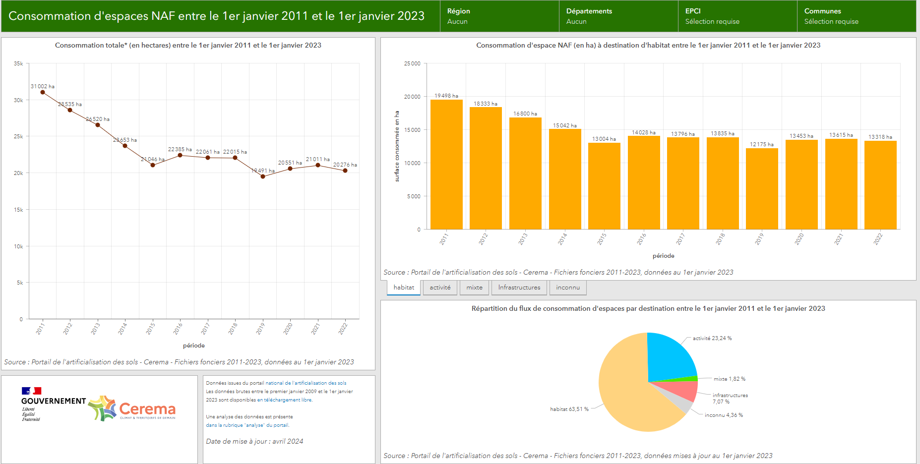 Des outils d'aide à la visualisation et à l'analyse de ces données sont aussi proposés, via un tableau de bord interactif et la publication d'indicateurs pré-calculés qui permettent d'observer l'évolution de l'artificialisation entre le 1er janvier 2009 et le 1er janvier 2024 à plusieurs échelles territoriales.
