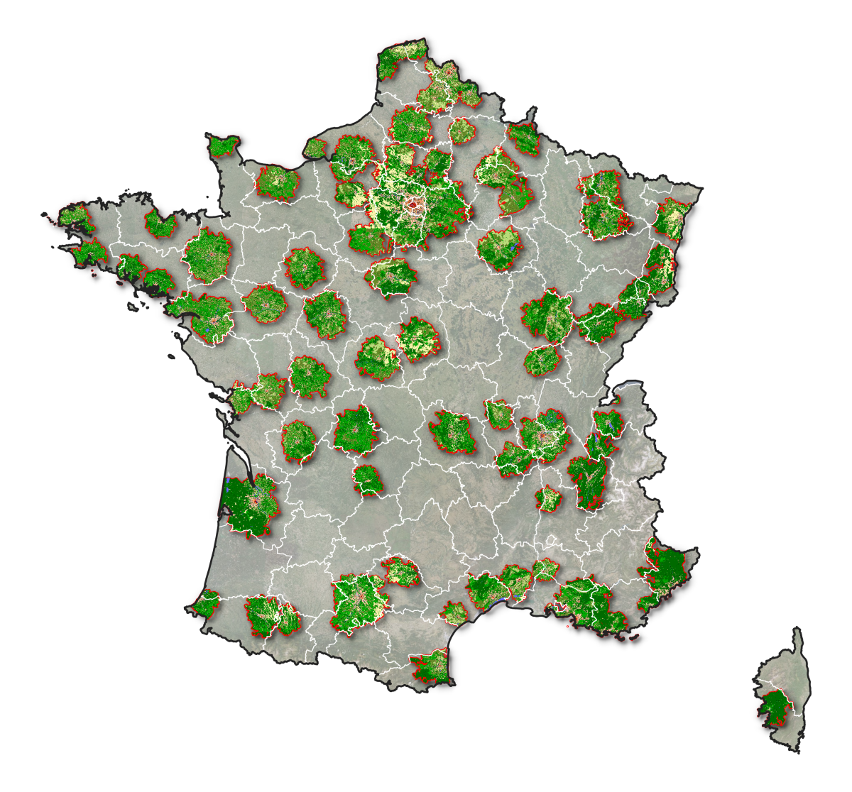 La production des cartes de LCZ s’est concentrée dans un premier temps sur les zones couvertes par l’Urban Atlas du programme européen d’observation de la Terre Copernicus. Elle concerne les aires urbaines de plus de 50 000 habitants de la France hexagonale :