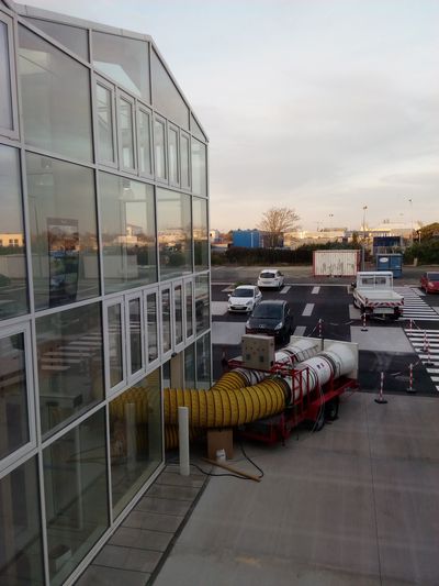 Récemment, un test d’étanchéité à l’air a été effectué à La Rochelle, dans des bâtiments de bureaux et destinés à l’enseignement. Pour chaque test, l’équipe du pôle QERA (qualité de l’enveloppe et renouvellement d’air) du Cerema prépare le bâtiment en colmatant les systèmes d’aération, et connecte le ventilateur au bâtiment.