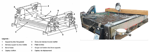 Les blocs bétons sont fixés sur un bâti comportant une partie mobile permettant d'imposer un déplacement normal qui est lui-même imposé par un dispositif à vis permettant d'obtenir une vitesse proche des conditions réelles de fonctionnement, avec une précision adaptée au souffle à vérifier.