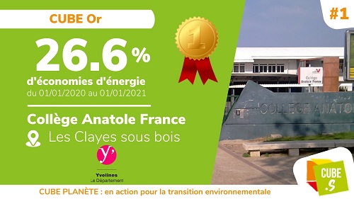 Le collège Anatole France de Les-Clayes-sous-Bois dans les Yvelines a remporté le Cube d'Or aussi bien pour la meilleure réduction des gaz à effet de serre de 29,5% que pour les meilleures économies d'énergie (26,6%).