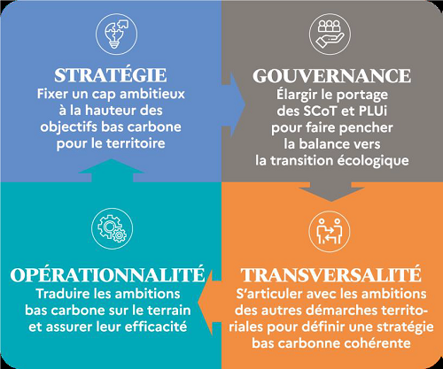 - D’amorcer la définition d’une stratégie territoriale bas carbone, en faisant du document d’urbanisme le socle du projet de territoire, qui porte des ambitions pouvant et devant être déclinées dans toutes les autres démarches (de planification et contractuelles) ;