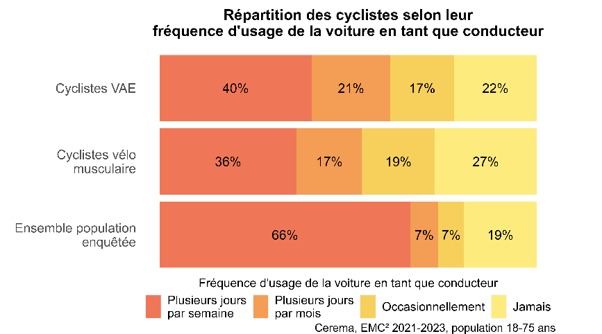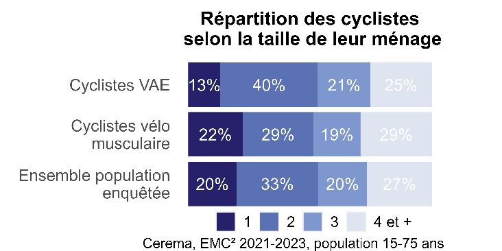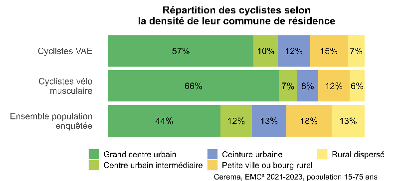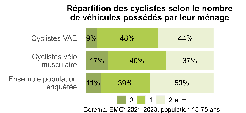 En limitant l’analyse aux grands centres urbains, où vivent la majorité des cyclistes, on observe que seulement 11% des cyclistes en VAE résident dans des ménages non motorisés, alors que ce sont 21% des cyclistes et 20% de l’ensemble de la population qui résident dans des ménages sans véhicule. Il semble donc, qu'à lieu de résidence équivalent, les usagers des VAE vivent dans des ménages plus souvent motorisés que l'ensemble de la population.