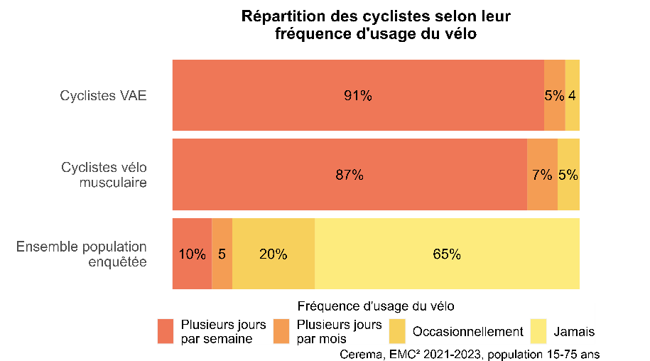 Pour en apprendre davantage sur cette pratique, nous nous intéressons dans cette étude aux personnes qui ont déclaré au moins un trajet en vélo à assistance électrique le jour de l’enquête. Ces personnes sont dénommées "cyclistes VAE" ou "cyclistes en vélo électrique" dans la suite de l’étude et seront comparées d’une part aux autres cyclistes (ceux ayant utilisé au moins une fois un vélo musculaire au cours de leur journée), d’autre part à l’ensemble de la population âgée de 15 à 75 ans.
