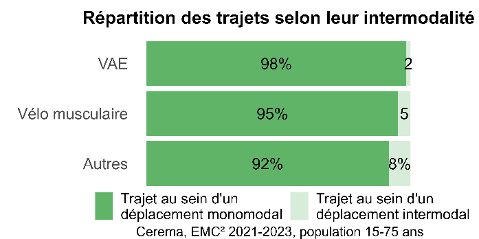 Les trajets en vélo électrique sont très majoritairement inscrits dans des déplacements monomodaux (pour 98% des trajets), c’est-à-dire qu’aucun autre mode mécanisé n’est utilisé avant ou après le trajet en VAE pour rejoindre la destination du déplacement. Cette part est encore plus forte que pour les trajets en vélo.
