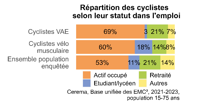 En moyenne plus âgés, les cyclistes du vélo électrique sont logiquement plus souvent retraités (21% d’entre eux sont retraités contre 14% chez les cyclistes en vélo musculaire) et moins souvent des étudiants : la pratique est marginale chez ceux-ci (moins de 3% des cyclistes en VAE sont étudiants).