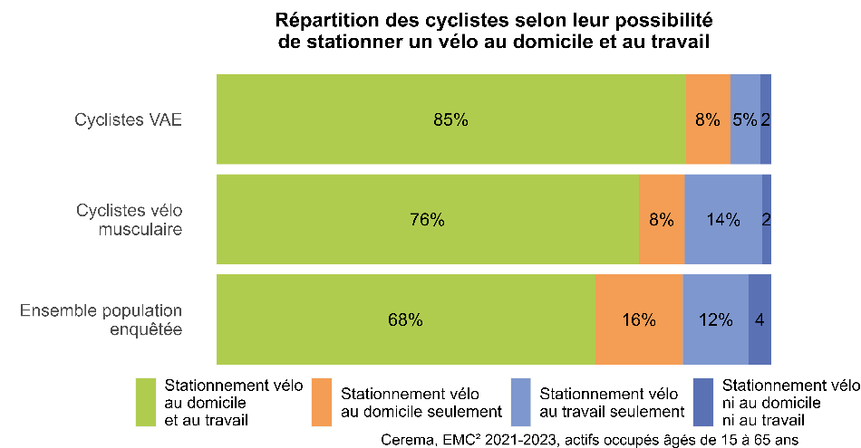 A leur domicile comme sur leur lieu de travail, les cyclistes en vélo électrique semblent disposer de plus de facilités à stationner leur vélo que les autres cyclistes et que le reste de la population. Une observation possiblement en lien avec les facilités de stationnement qui pourraient être une condition à l’utilisation d’un vélo électrique, de façon encore plus forte que pour l’utilisation d’un vélo musculaire.