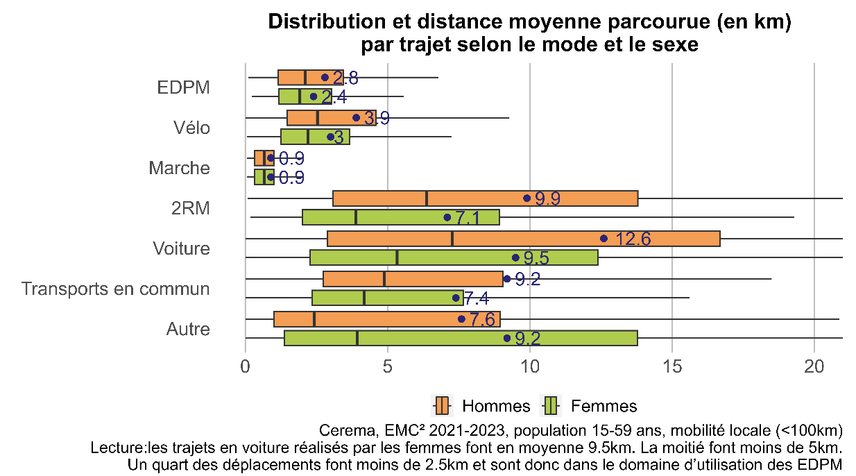 Dans l’ouvrage Mobilité du quotidien (article « Pas à pas, le retour de la marche », p80), l’usage des engins de déplacement personnel (motorisés ou non) au cours des années 2010 est présenté comme une version augmentée de la marche, à mi-chemin entre la marche et le vélo, avec une distance moyenne de trajets de 1.5km (une moyenne incluant alors les trottinettes non électriques). En isolant désormais les EDPM motorisés dans le recueil des EMC², on constate que l’utilisation de ces derniers se rapproche plutôt de la pratique du vélo, avec un domaine d’utilisation particulièrement proche : les distances moyennes parcourues par trajet sont légèrement inférieures à 3km quand celles effectuées à vélo sont légèrement supérieures à cette valeur. Elles sont bien au-dessus des distances parcourues à pied (900m) et restent largement au-dessous des distances parcourues en deux-roues motorisés (7 à 10 km selon le genre) et en voiture (10 à 13km selon le genre). On note tout de même qu’un quart des déplacements motorisés en voiture, deux-roues motorisé, et transports en communs ont une distance rentrant dans le domaine d’utilisation des EDPM. On peut enfin souligner que les distances parcourues en EDPM varient peu selon le genre au contraire de certains autres modes individuels motorisés.