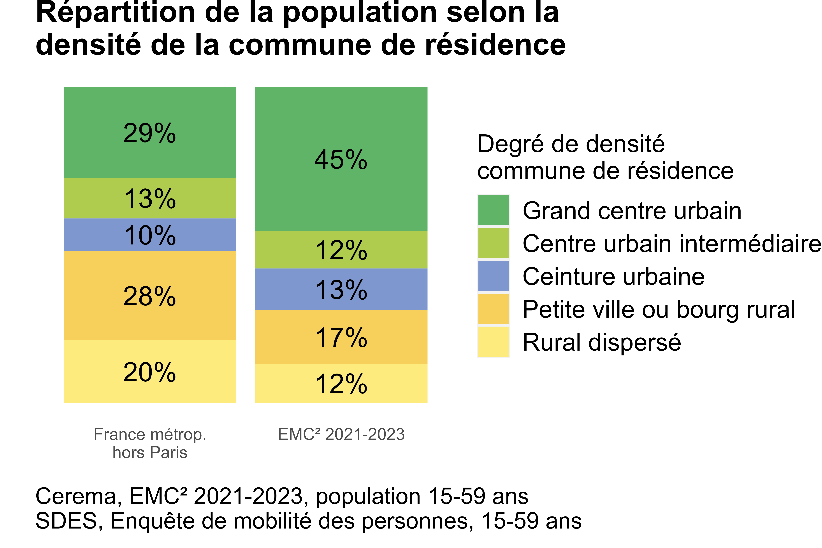 2 Les comparaisons nationales sont issues de l’enquête nationale de mobilités réalisée par le SDES, couvrant la France métropolitaine. Notre population de comparaison exclut l’Ile-de-France.