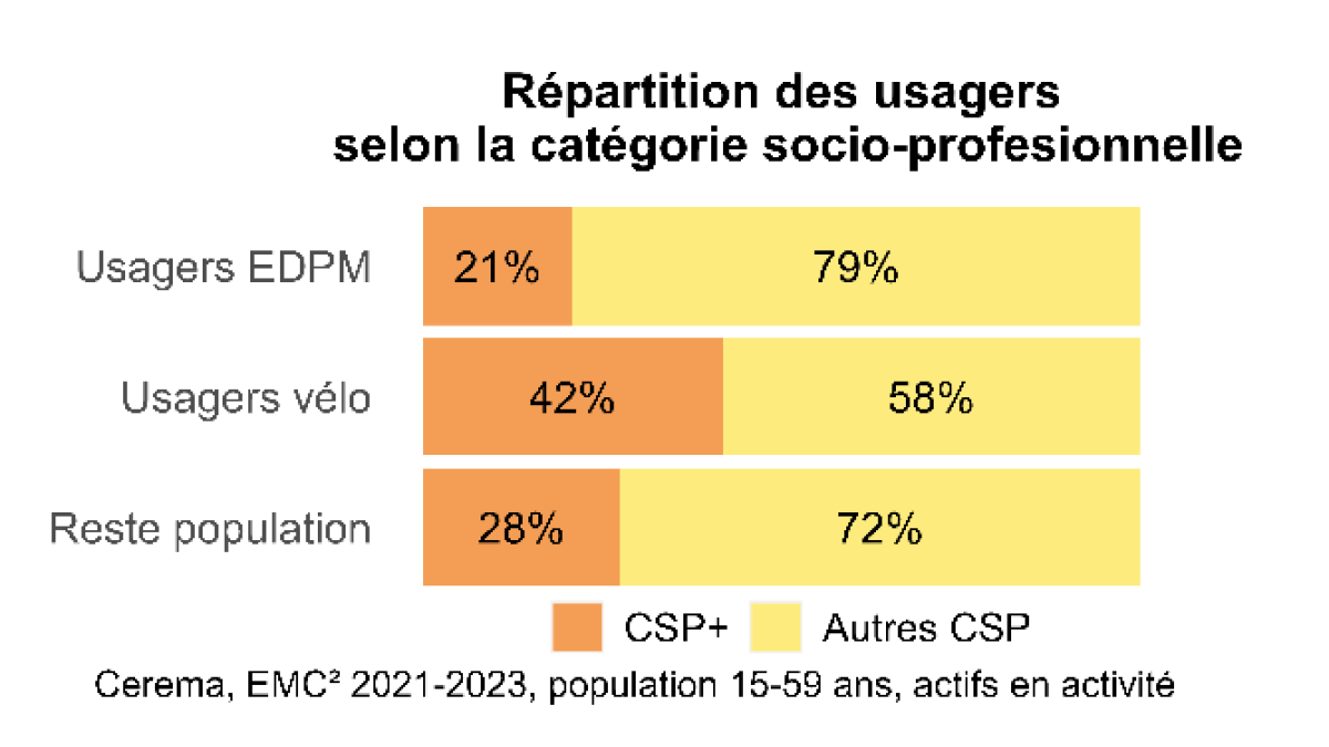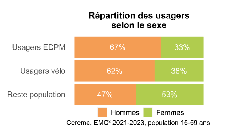 Les usagers des EDPM se distinguent également par une pratique plus masculine : les hommes y sont surreprésentés (67% des usagers), une part légèrement supérieure à celle constatée chez les cyclistes.