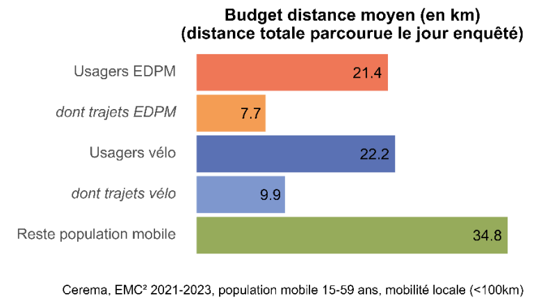 De plus, sur l’ensemble d’une journée, les usagers des EDPM se déplacent autant que les cyclistes. Ils parcourent en moyenne 21,4km par jour, dont un tiers en EDPM : des budgets distance très comparables à ceux des cyclistes et en deçà de la moyenne du reste de la population s’étant déplacé le jour de l’enquête. Pour les usagers des EDPM, les distances parcourues autrement qu’en EDPM se partagent entre voiture (7,7 km par jour en moyenne) et transports en commun (5,7 km par jour en moyenne).