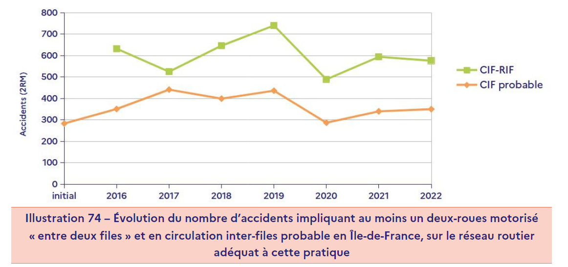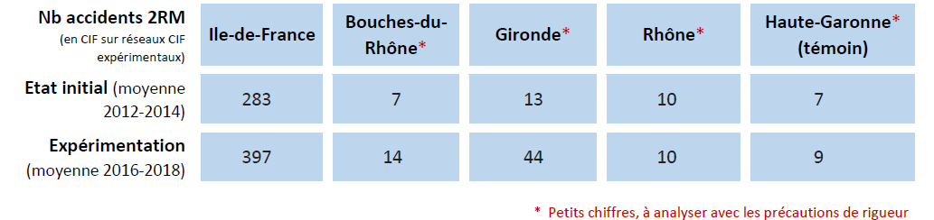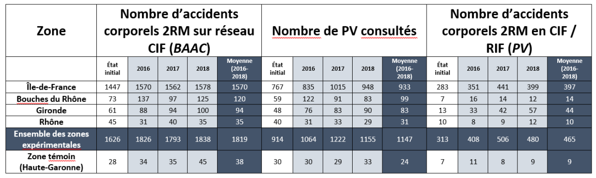 Ainsi, la donnée générale de 49%, calculée à partir de comparaison de moyenne est peu adaptée à ce contexte. Il convient davantage de noter l’augmentation de 40% des accidents impliquants un motard en CIF ou RIF sur le réseau expérimental de l’Ile-de-France entre l’état initial et les années expérimentales (2016-2018) dont une partie est probablement dû à un meilleur recensement par les forces de l’ordre.