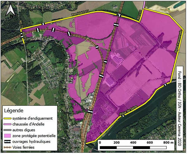 En s’appuyant sur une méthodologie développée par le Cerema dans le cadre de l’Analyse d’opportunité et de faisabilité d’un projet d’aménagement d’intérêt commun des ouvrages de protection sur le bassin de la Loire pour le compte de l’Établissement public Loire, il a été possible de définir un système d’endiguement cohérent.