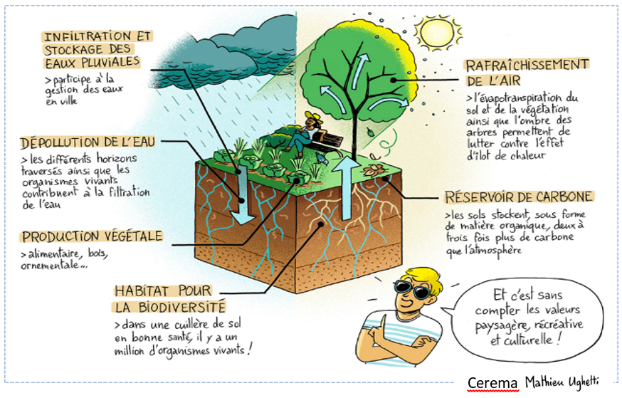 Dans un contexte de changement climatique et de forte demande sociale et environnementale pour plus de nature en ville, la préservation des sols, associée à la renaturation ou la re-fonctionnalisation des sols, contribuent à limiter ces phénomènes.