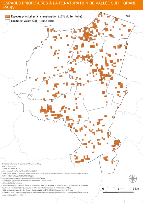 C’est dans ce cadre que la DRIEAT a missionné le Cerema Ile-de-France pour développer une méthodologie d’identification du potentiel de renaturation à l'échelle de l’unité urbaine parisienne[1] (livrable 1) et de l'EPCI de vallée Sud Grand Paris (livrable 2) contribuant à établir une stratégie opérationnelle de résilience et d’adaptation au changement climatique de ses territoires.