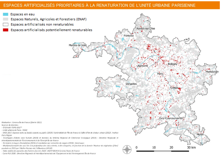 La méthode, utilisant des données plus fines qu’à l’échelle de l’unité urbaine parisienne, a permis d’identifier des zones plus précises (carreaux de 100m de côté) à renaturer qui restent un potentiel théorique et qui devront être confrontées aux réalités du terrain.