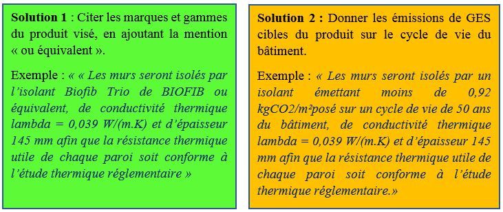 Une solution raisonnable pour obtenir des produits disposant des FDES visées semble donc de citer dans le CCTP les gammes et marques correspondant à la FDES et de laisser la possibilité à l’entreprise de proposer éventuellement un autre produit, à condition qu’elle prouve que ses performances en émissions de GES sur 50 ans de vie du bâtiment sont équivalentes.