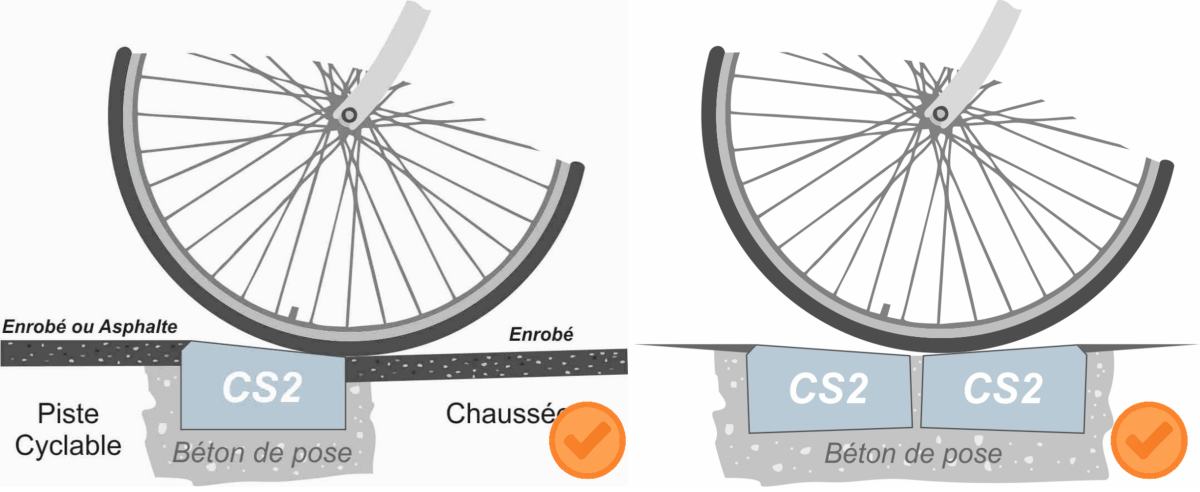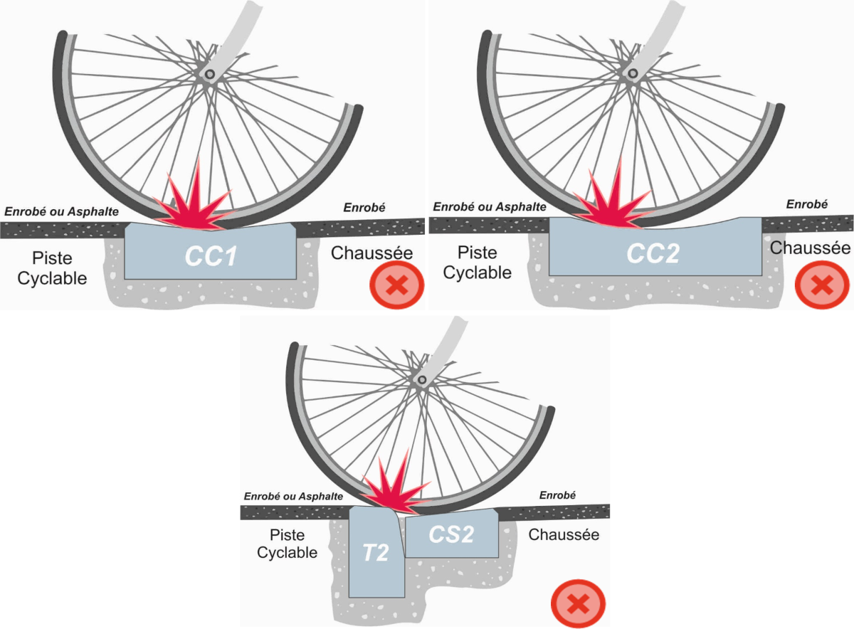 Toute autre solution est à éviter. En particulier, les bordures P, T, A, I ou encore les éléments CC, en travers d’une piste, ne conviennent pas.