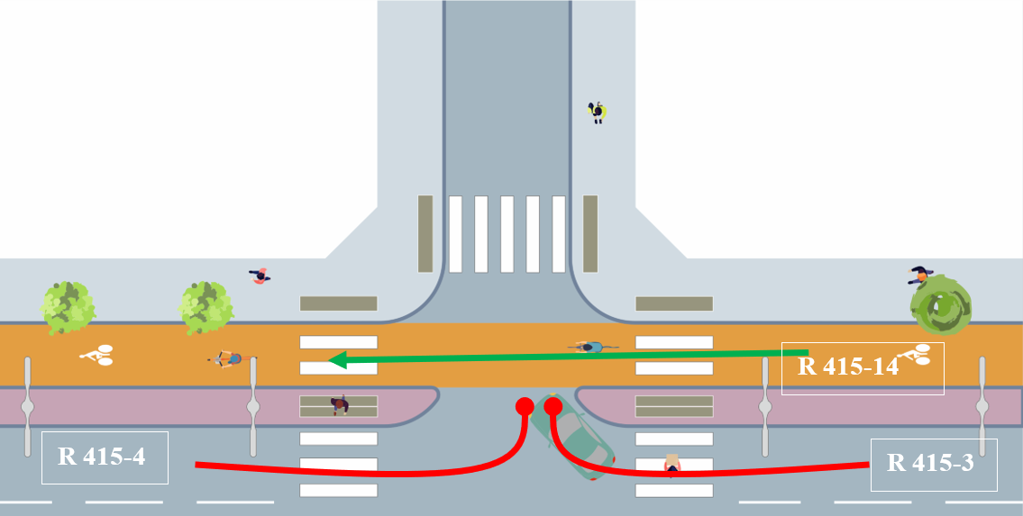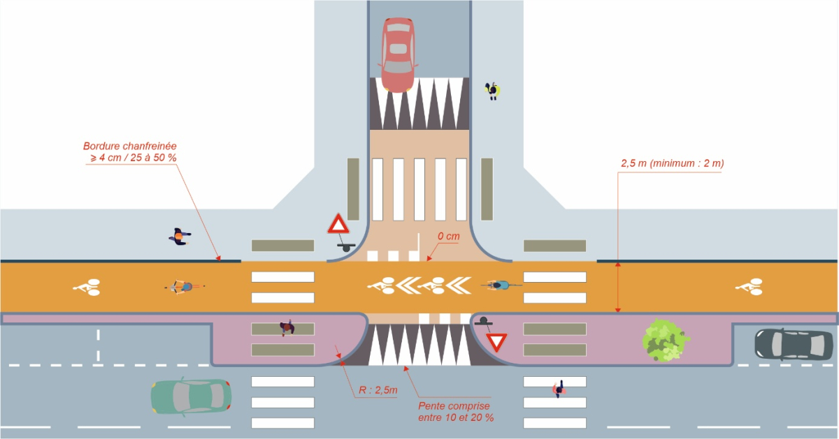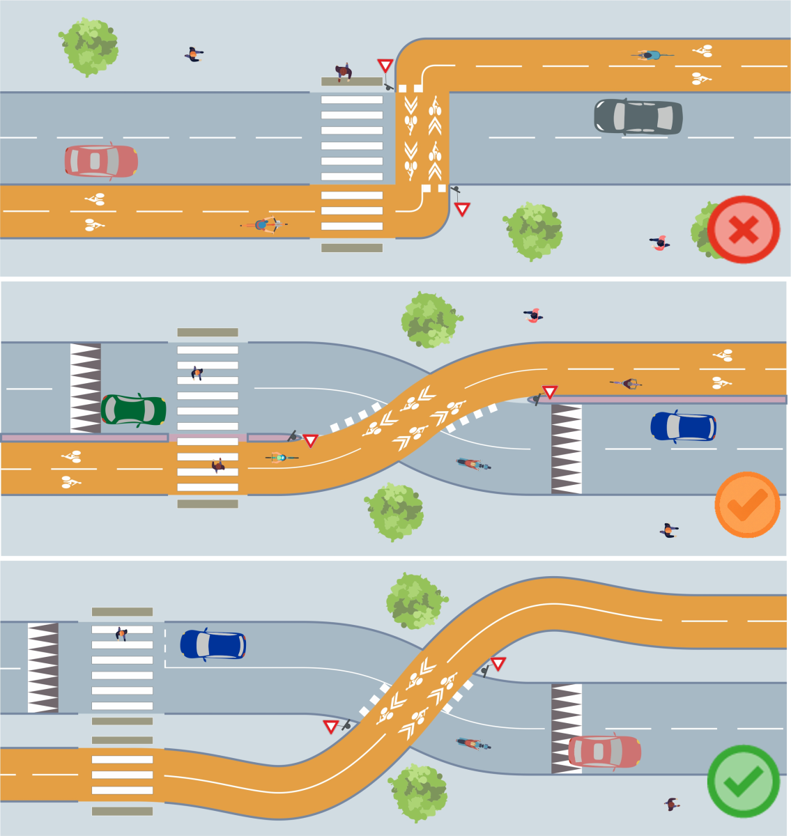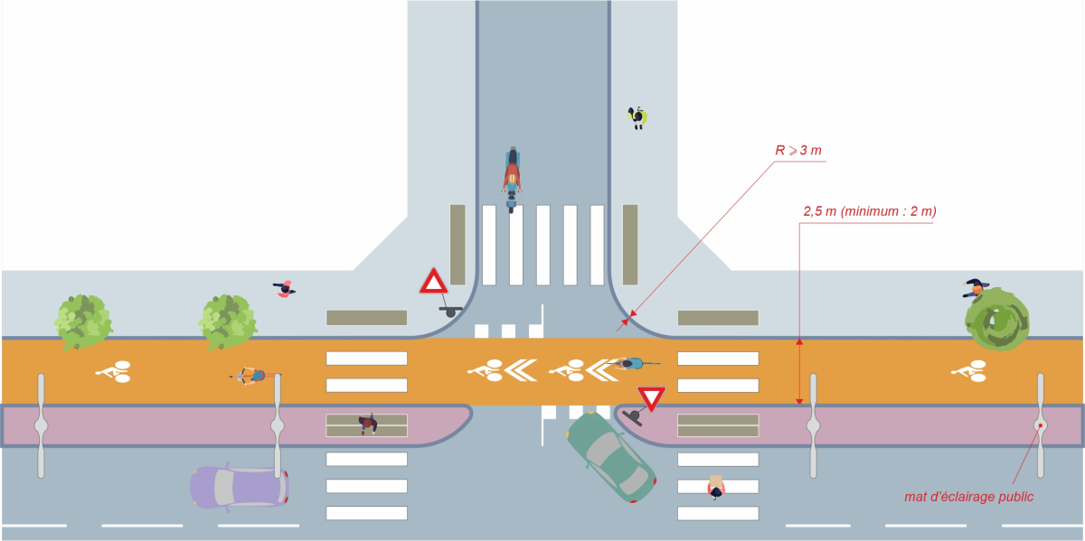 L‘aménagement du schéma de droite résout ces deux problèmes grâce à un rayon de courbure adapté à un mouvement tournant. Il est par ailleurs impératif pour les véhicules motorisés et les cyclistes de céder le passage au piéton qui traverse.