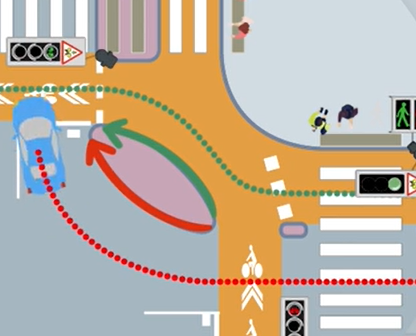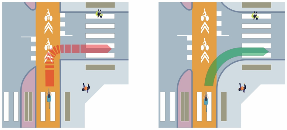 Ces carrefours visent à réduire le problème de l’angle mort pour une traversée cyclable en conflit avec des mouvements tournants dans la même phase de feu.