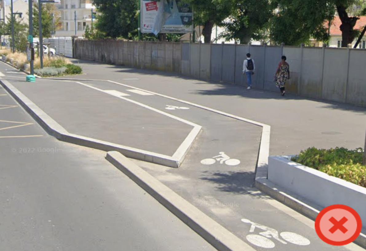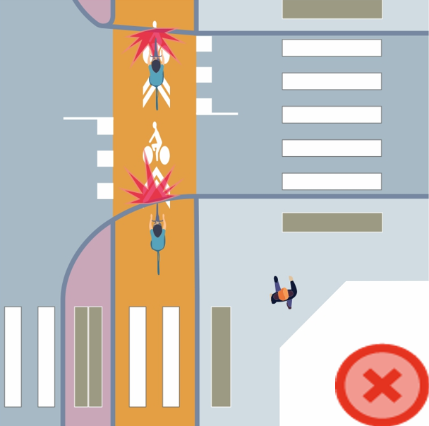 Enfin, cette orientation peut faire croire à l’automobiliste que le cycliste quitte son aménagement pour tourner dans la rue perpendiculaire, ce qui risque de le surprendre lorsque le cycliste traverse en réalité la voie dans laquelle la voiture s’engage.