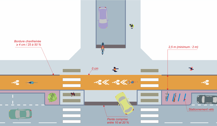 Le traitement à rechercher prioritairement est la continuité de matériau, sans bordure en travers :