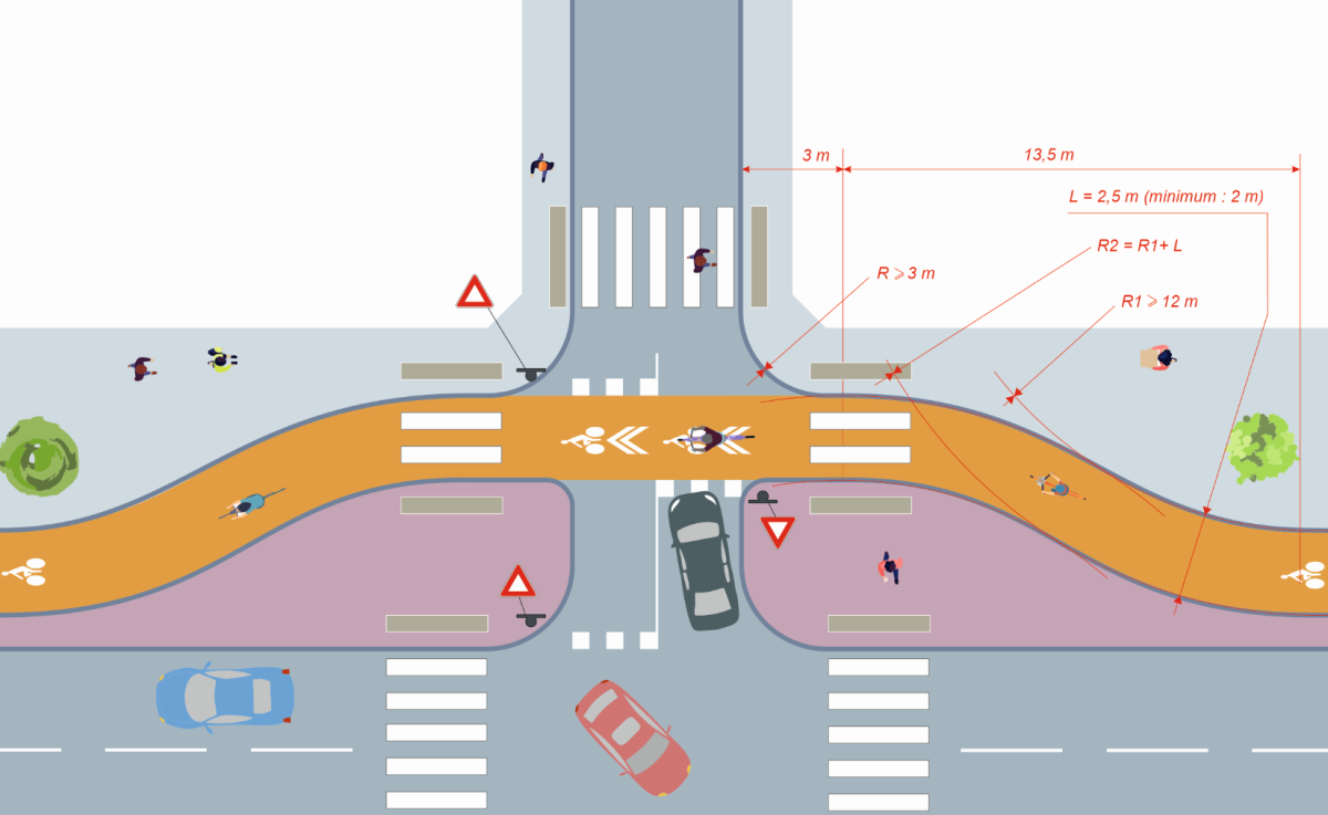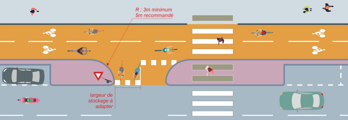 En cas de recours à cette solution, la piste doit impérativement respecter les rayons de courbure des trajectoires directes, de 10 à 20 m. Dans le cas contraire, la trajectoire n’est pas crédible, elle est pénalisante, et dans certains cas, elle augmente le danger, en mettant les cyclistes dans un mouvement tournant juste avant la traversée, qui met les voitures dans l’angle mort et peut laisser croire aux automobilistes que les cyclistes ne continuent pas tout droit.