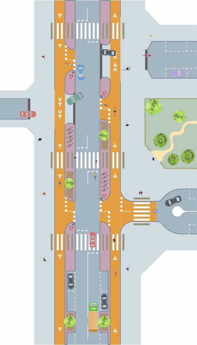 Des rayons de courbure faibles imposés aux véhicules motorisés aideront à maîtriser leurs vitesses dans les mouvements tournants. Il est aussi possible de mettre en œuvre des aménagements de modération de la vitesse des motorisés comme le plateau.