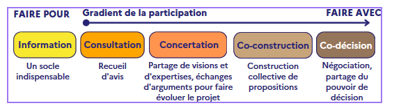 Le livrable de l'atelier se propose de se concentrer principalement sur la concertation dans les instances non spécifiques et sur les clés pour inclure les personnes à besoins spécifiques. Dans un premier temps, le livrable reviendra sur la définition de la participation citoyenne et des différents degré d'implication de la population. Le second temps abordera les questions de la communication et de la mobilisation des acteurs éloignés de la participation notamment grâce aux structures et associations spécialisées. Dans un troisième temps, le livrable présentera sous forme de tableau les points clés pour organiser une démarche participative accessible à tous en fonction de la temporalité de la concertation (avant / pendant / après) et les outils permettant de faciliter la participation des publics spécifiques. Enfin, une liste de ressources viendra compléter le livrable.