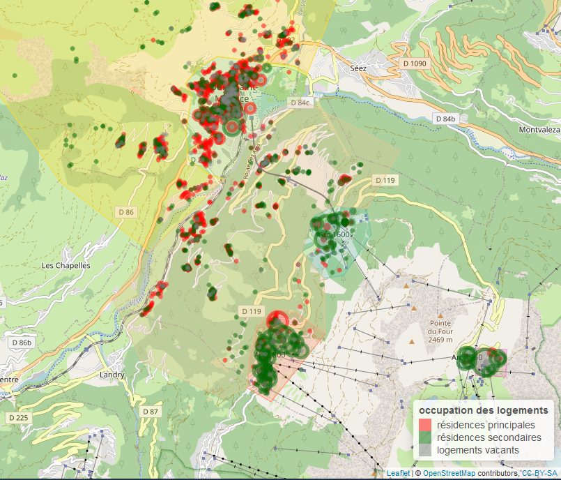 L'utilisation de ces données a permis de donner une représentation spatialisée de l'habitat, en distinguant par secteur géographique, les différentes formes d'habitations (maisons, appartements, copropriétés) et leur occupation (résidences principales, secondaires, logements vacants). La mise en évidence des dynamiques des constructions neuves et des marchés immobiliers a permis de mieux caractériser la pression foncière sur ce territoire à double vocation résidentielle et touristique.
