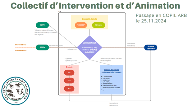 Mélinda a exposé dans sa présentation les différents outils d’animation, outils numériques et papier, groupes de travail, journées d’échanges, etc. à la disposition des acteurs du territoire. Ces outils ont pour objectif de créer du lien, des synergies entre les acteurs, mais aussi de sensibiliser aux problématiques liées aux EEE. Dans le cadre de la coordination de la gestion au sein des HdF, l’ARB a également préfiguré le Collectif d’Intervention et d’Animation EEE : dispositif d’alerte, coordination des sollicitations et redirection vers les intervenants (réseau d’acteurs régionaux, formateurs, groupes de travail, brigade pour les espèces priorité 1) qui doit être soumis au COPIL ARB le 25 novembre