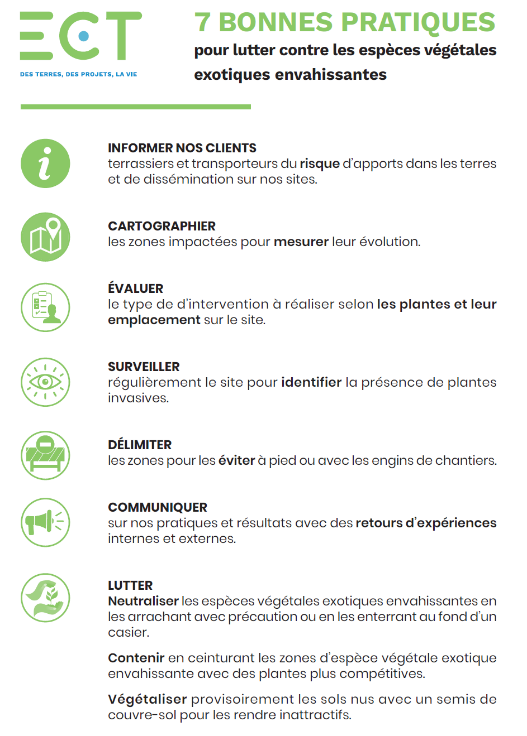 Le groupe ECT propose un modèle d’aménagement du foncier non-bâti au service des territoires qui utilise les terres inertes issues des chantiers de la construction. Il réhabilite ainsi des sites délaissés ou des friches pour leur donner un nouvel usage non bâti. En parallèle, l’entreprise, disposant du label "Entreprise Engagée pour la Nature" , s’est créé un plan d’action contre les EEE, la formation et la production de supports de sensibilisation pour ses agents.