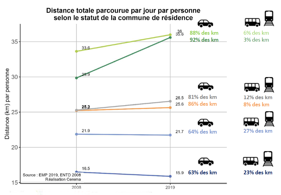 Le diagnostic met en évidence que les zones rurales ou peu denses regroupent à ce jour un tiers de la population mais 45% des km parcourus. En effet, alors que la population métropolitaine française réalise environ 26 km/jour depuis 10 ans, les habitants des zones peu denses parcourent 36 km/jour, et cette distance est en augmentation de 3 à 6 km cette dernière décennie. Ces distances importantes sont réalisées à 90% en voiture. La voiture permet également de réaliser la moitié des déplacements de moins de 2 km dans ces zones rurales contre un tiers pour l’ensemble de la population (40% vit en zones très denses).