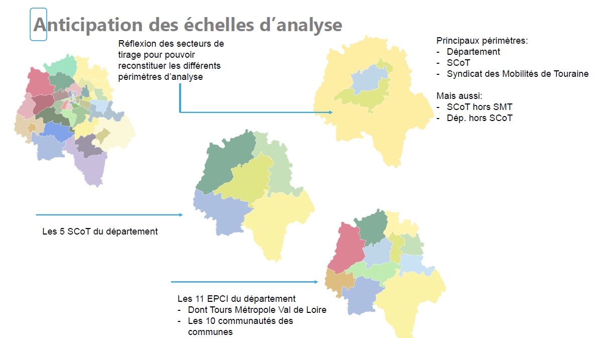 Le second incluant des territoires plus ruraux jusqu’aux frontières départementales a pu bénéficier d’un outil très riche permettant d’analyser la mobilité quotidienne tout mode tout motif et de partager ainsi des indicateurs communs sur tout le département de l’Indre et Loire. Du fait de cette étendue géographique, le plan de financement a impliqué la Région. Un groupement de commande a été établi entre les AOM du territoire afin de ne passer qu’un seul marché. Au total 8700 personnes ont été interrogées, réparties de telle sorte que différentes analyses spatiales soient possibles selon les besoins des territoires.