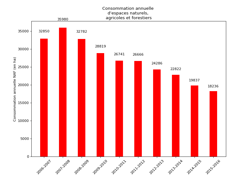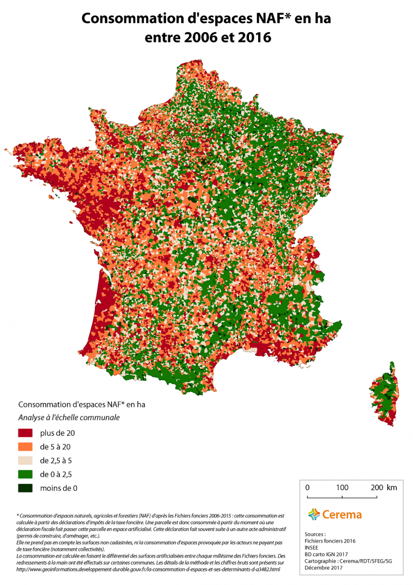 Au niveau national, la consommation d’espaces NAF (naturels, agricoles et forestiers) diminue constamment, pour atteindre 18 236 ha entre le 1er janvier 2015 et le 1er janvier 2016. En parallèle, la consommation d’espaces se polarise, en suivant notamment l’évolution de la population. On observe ainsi une réelle différence entre l’Ouest, dynamique et fortement consommateur d’espaces et l’Est de la France.