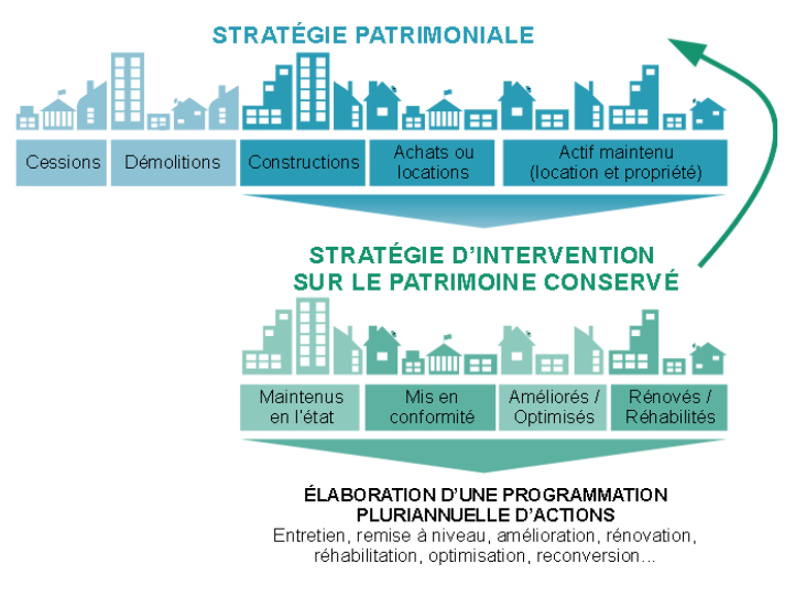 - A l'échelle du patrimoine pérenne, la stratégie d'intervention vise à maintenir le patrimoine de la collectivité en "bon état" et la stratégie d'exploitation et de maintenance vise à optimiser leur gestion quotidienne.