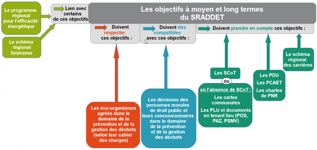 - Les décisions prises par les personnes morales de droit public et leurs concessionnaires dans le domaine de la prévention et de la gestion des déchets doivent être compatibles avec les objectifs à moyen et long termes du SRADDET (voir article L. 541-15 du code de l'environnement* pour plus de précisions).