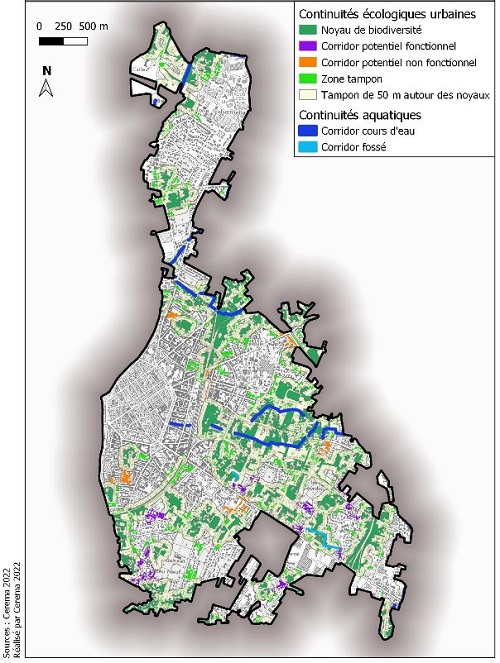 Pour les continuités écologiques urbaines, une méthode spécifique a été développée car la faible présence de milieux naturels, le morcellement de l’occupation du sol et l’importance des obstacles (bâti, infrastructures) rendent la modélisation difficile. Une cartographie fine de la végétation urbaine a été créée à partir de différentes couches de données géographiques (végétation à partir d’images satellites et de photos aériennes). Ensuite, des densités de végétation par maille de 100 x 100 mètres ont été calculées (carte ci-contre). La végétation comprise dans des mailles dont la densité est supérieure à 0,4 m²/m² a été considérée en "noyau de biodiversité". Les zones périphériques ont été classées en "corridors potentiels" fonctionnels ou non fonctionnels ou en "zones tampons" selon leur connexion avec les noyaux.