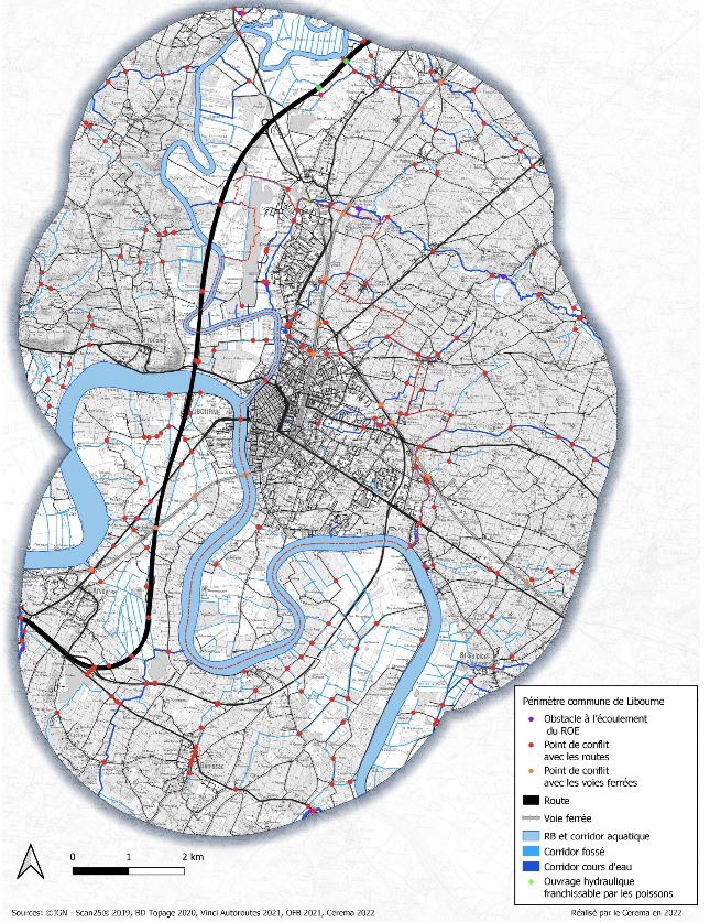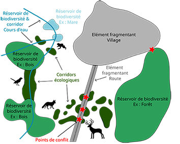 Ces continuités peuvent être interrompues par des éléments fragmentants comme des infrastructures de transport ou des obstacles au cours d’eau (barrages, seuils…), réduisant ou empêchant le déplacement des espèces. Les points d’intersection entre corridors et éléments fragmentants sont dénommés ici « points de conflit ».