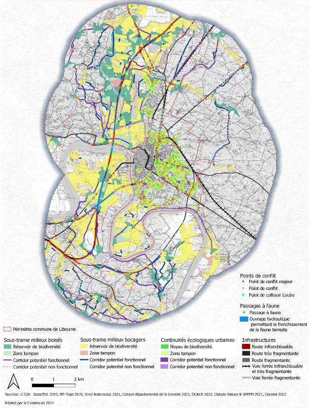 Enfin, les points de conflit ont été identifiés en croisant les réseaux routier et ferré avec les corridors terrestres et les cours d’eau, en ajoutant les points de passages possibles (passages à faune).
