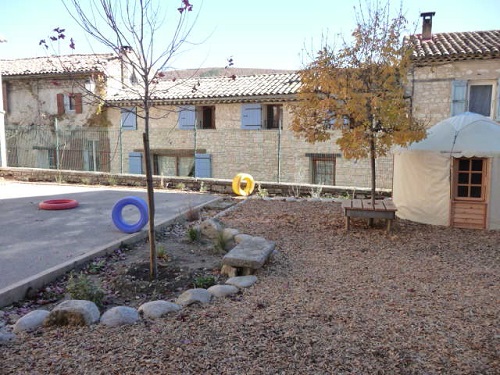 La petite cour a été désimperméabilisée partiellement : copeaux de bois, pleine terre compost, et plantations cohabitent aujourd’hui avec l’asphalte où jeux de vélos et ballons sont toujours possibles. Des gradins, des bancs en bois ou encore une yourte ont été construits, notamment grâce à la participation des parents, ce qui a permis la maîtrise des coûts du nouveau mobilier.